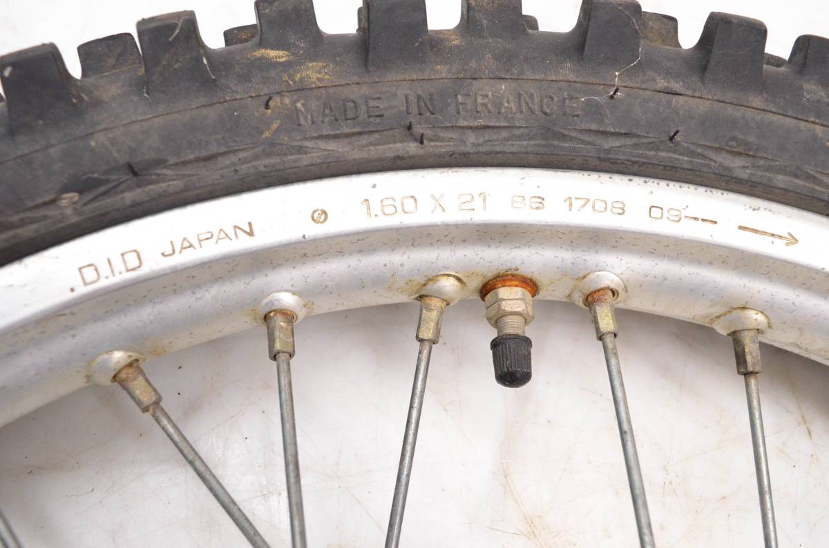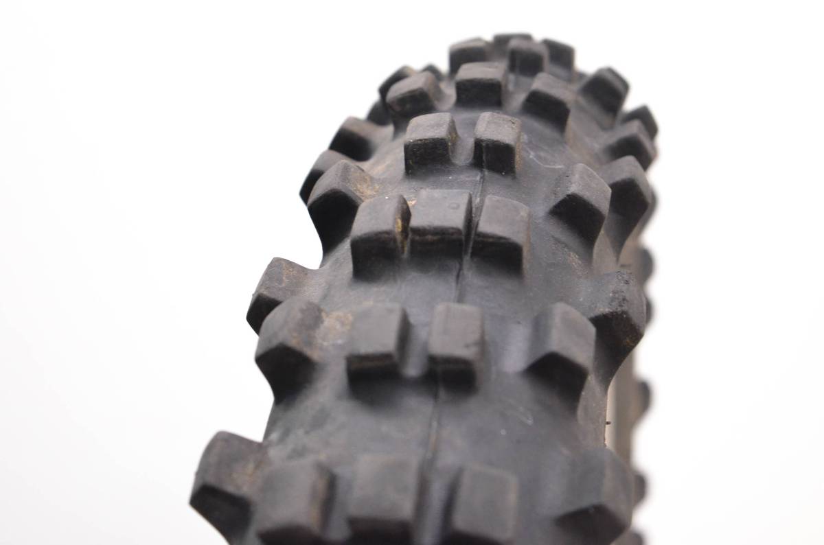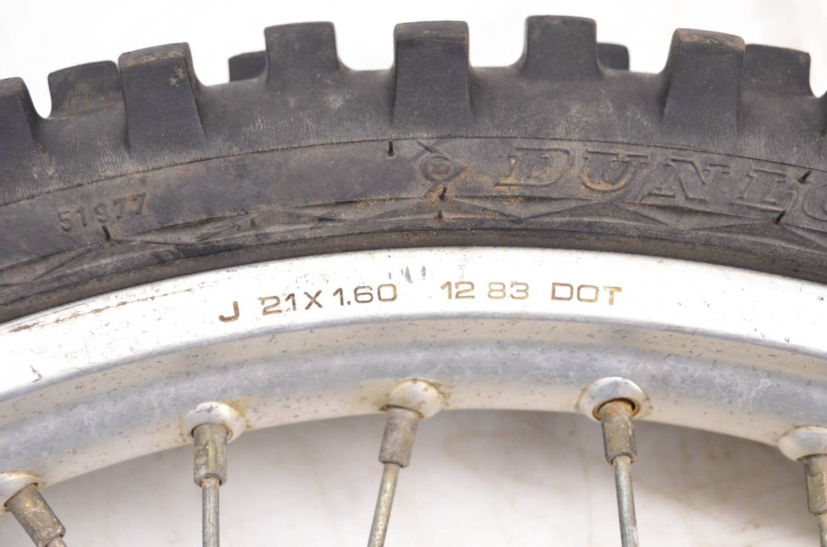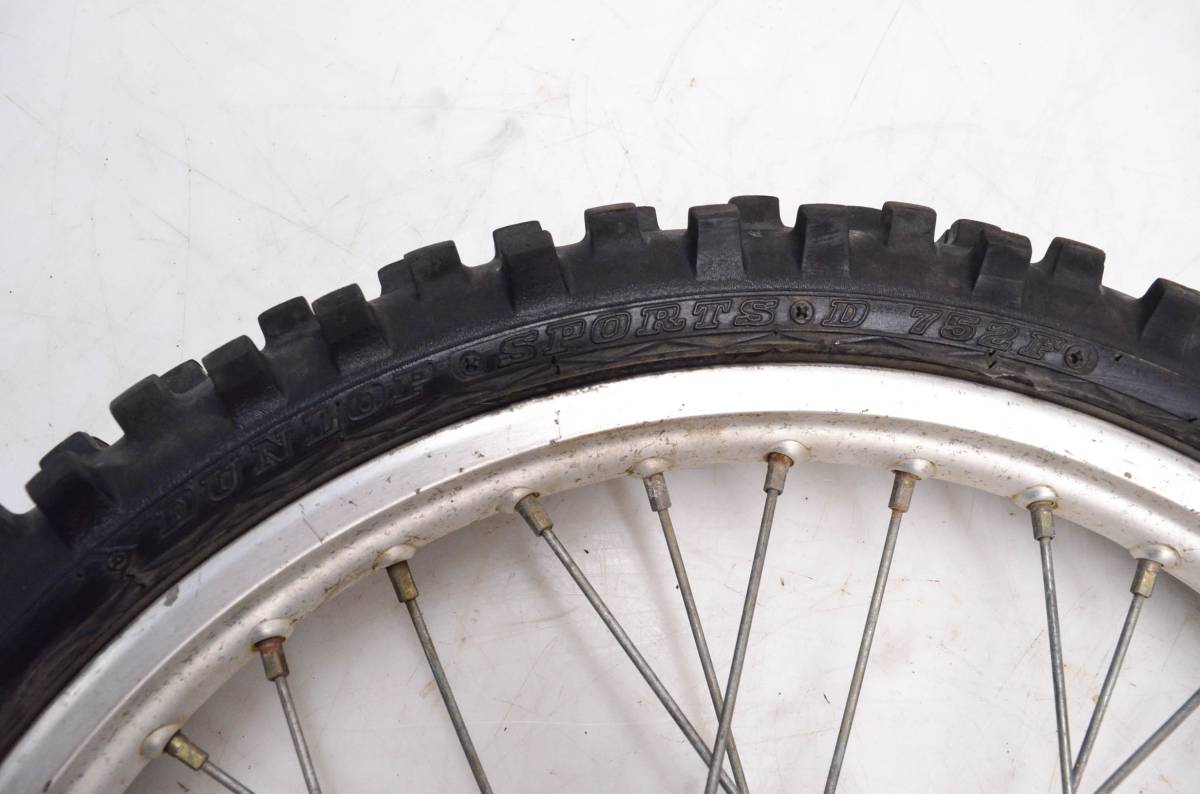 Rim is in good condition. Has light wear and scuff marks. Tire is in good shape with no plugs or holes. Dunlop Sports D752F tire, 80/100-21. Comes as pictured. Was removed from a 1985 Honda XR200R.