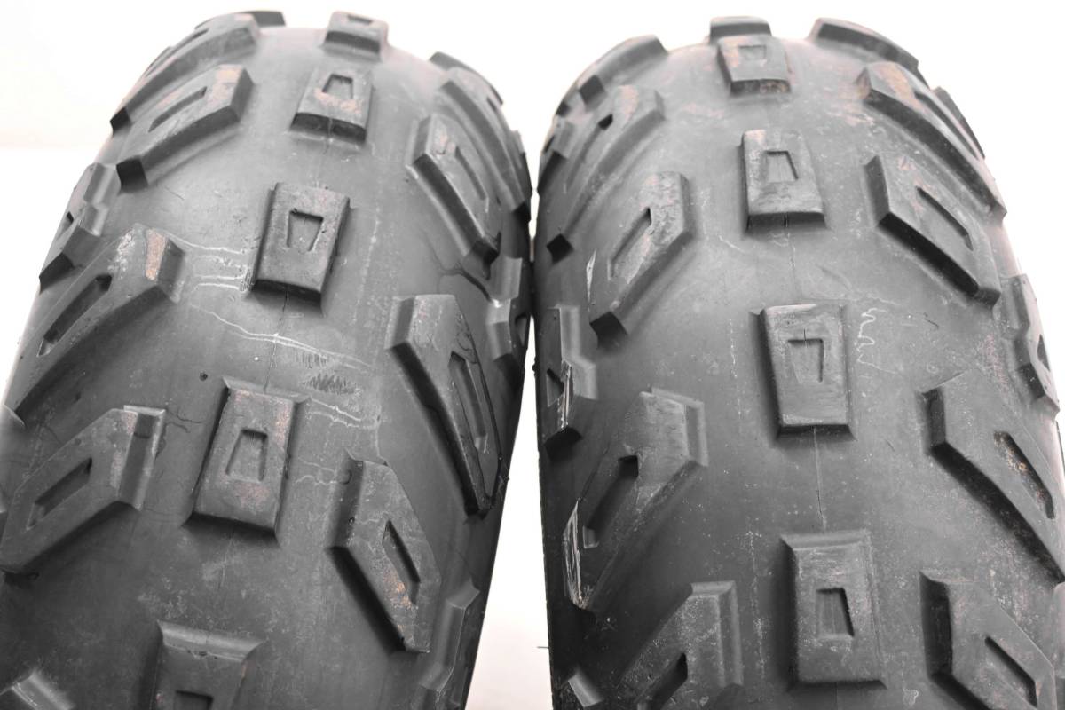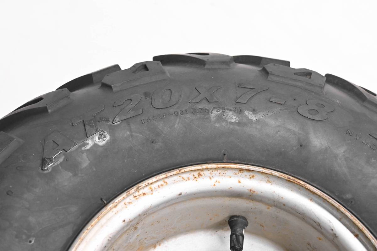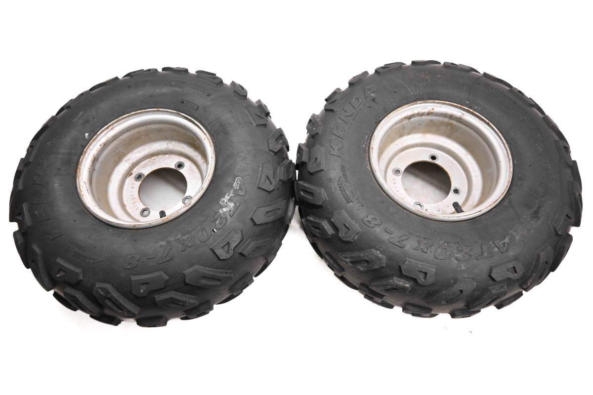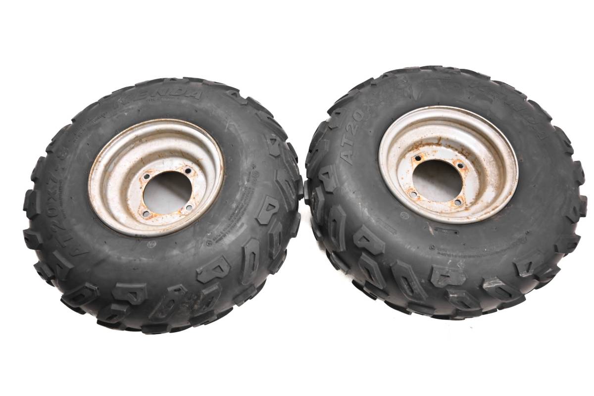 Rims are in good condition. Have light wear and scuff marks. Tires are in good shape with no plugs or holes. Kenda tires 20x7-8. Comes as pictured. Was removed from a 2003 Polaris Sportsman 90 2x4.