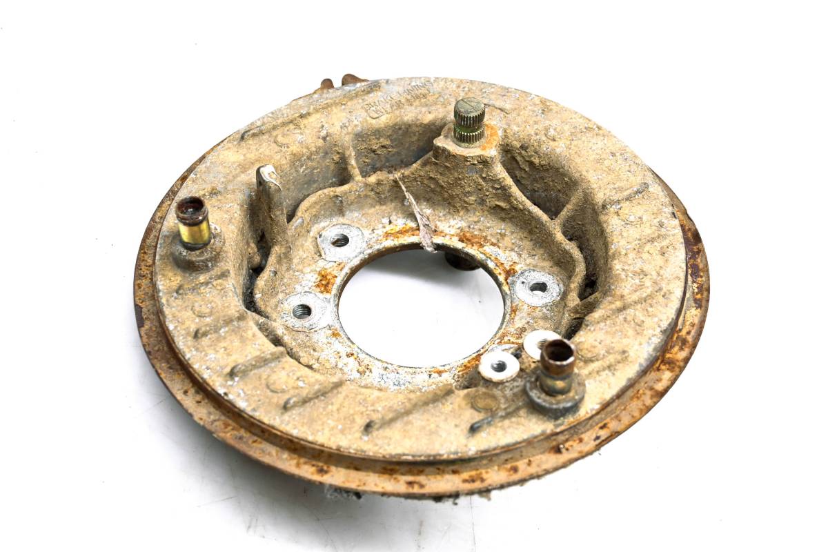 Brake drum plate is in good working condition with no cracks or repairs. Finish has light rust. Comes as pictured. Was removed from a 1999 Suzuki Quadrunner 250 4x4 LTF250F with 1809 miles.