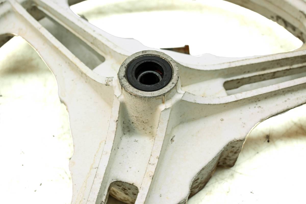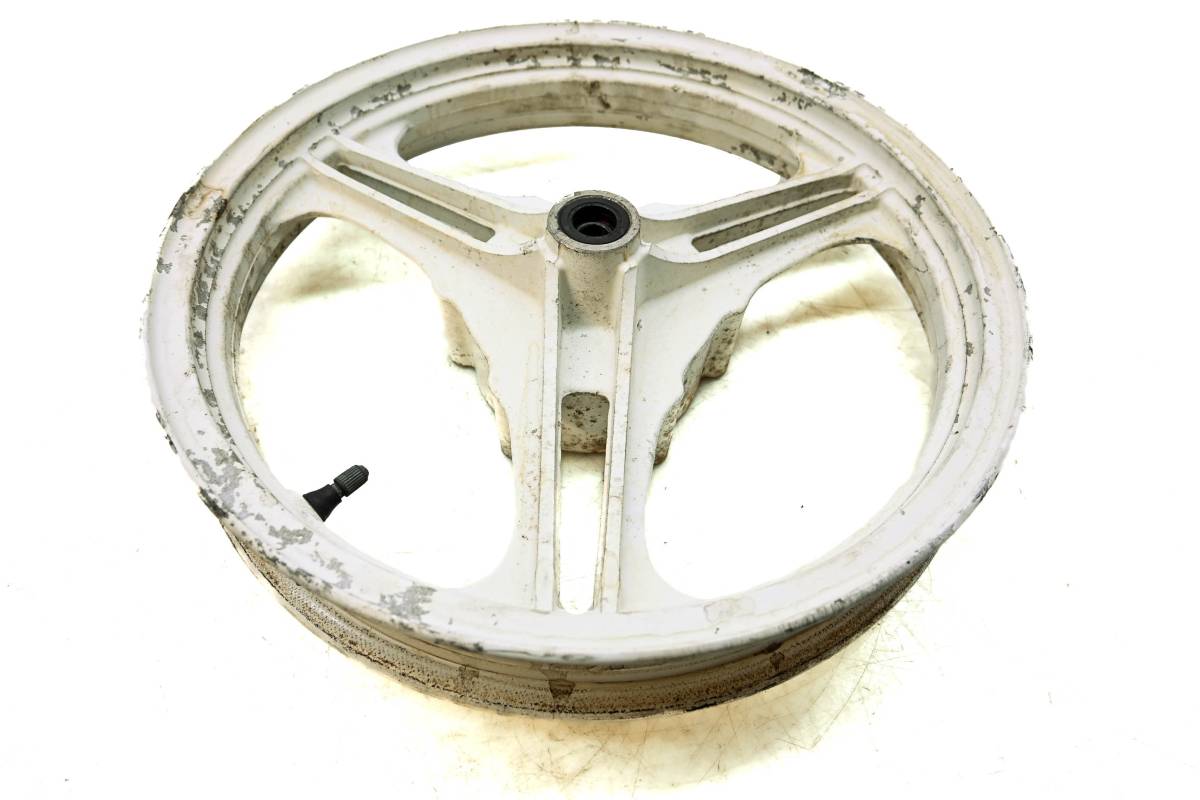 Rim is straight and in good condition. Outside edge has some dings and wear from use. Comes as pictured. Was removed from a 1992 Kawasaki Ninja 500 EX500.