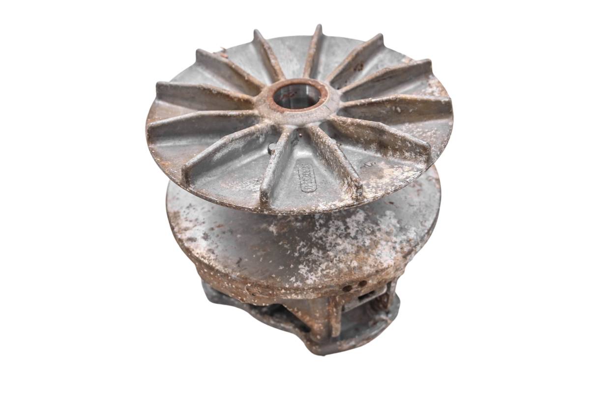 Clutch is in poor condition. Center shaft is corroded. Ramps and rollers have light wear. Pulley sheaves have light wear. Needs to be cleaned and rebuilt. Comes as pictured. Was removed from a 1987 Polaris Trail Boss 250 4x4.