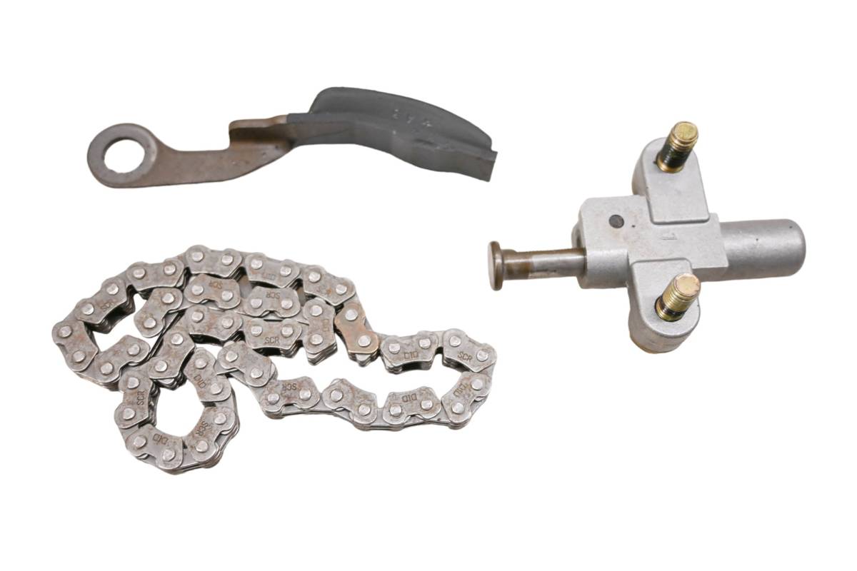 Chain guide and tensioner are in good condition. Guide has light wear from chain. Comes as pictured. Was removed from a 2001 Honda Rancher 350 ES TRX350FE with 1559 miles.