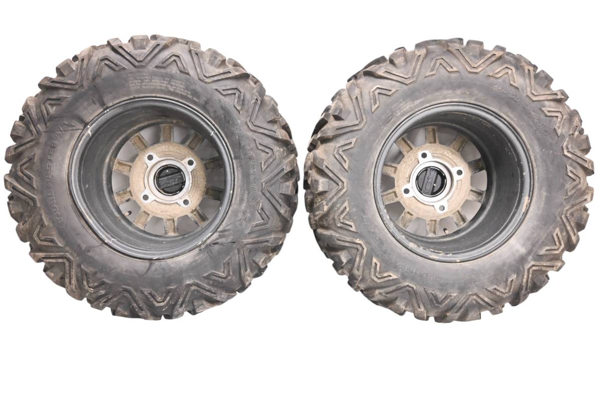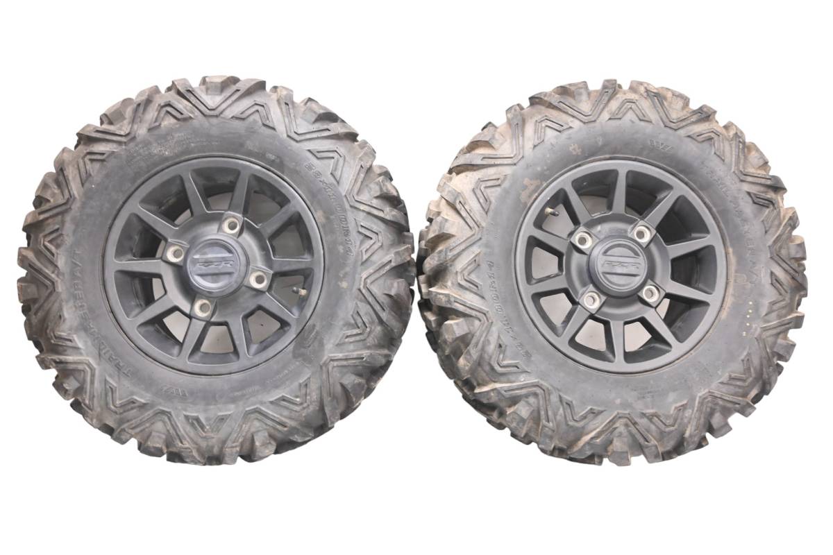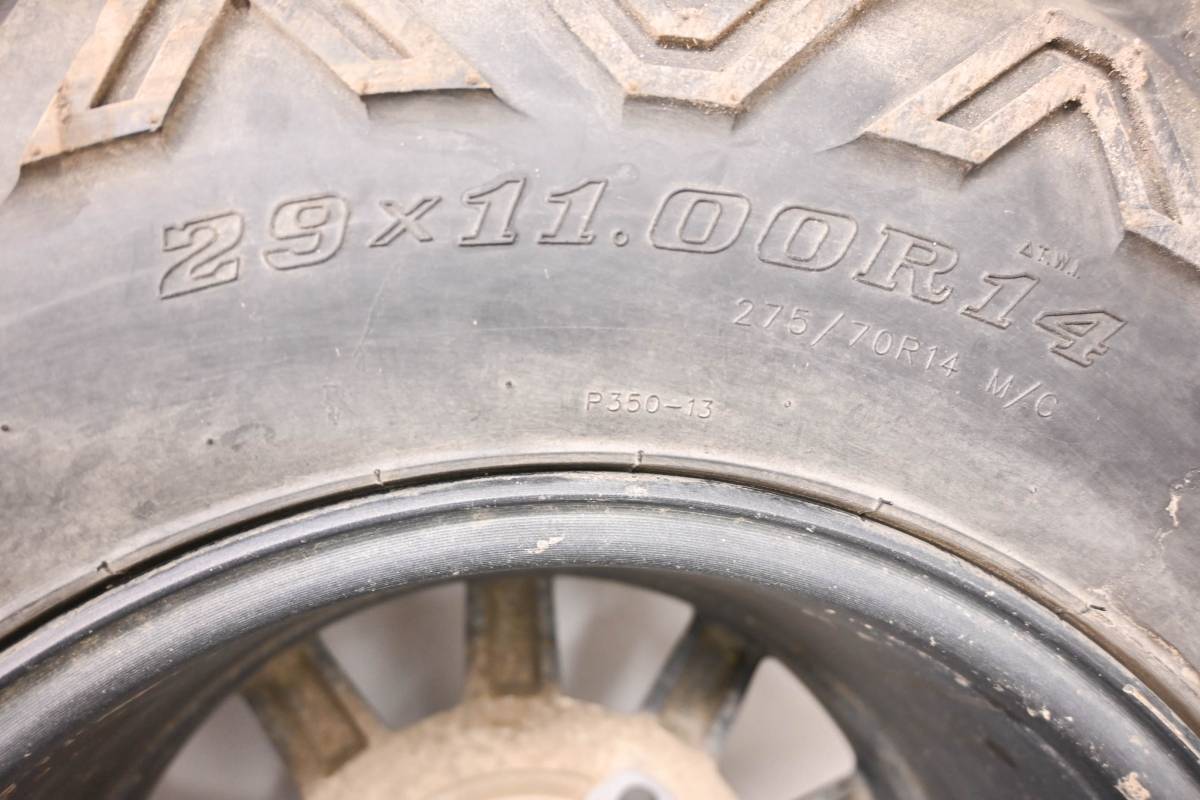 Rims are in decent condition. One rim is dented. Has light wear and scuff marks. Tires are in good shape with no plugs or holes. Trailmaster A/T tires 29x11-14 4/156. Comes as pictured. Was removed from a running 2020 Polaris RZR 900 Trail Fox Edition with 3313 miles and 204.8 hours.