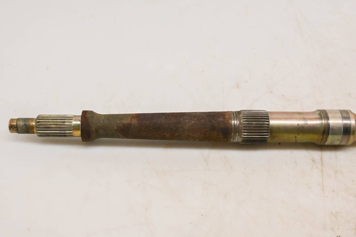 Axle is straight and in good condition. Finish has light wear. Splines and threads are straight. Comes as pictured. Was removed from a 1999 Kawasaki Prairie 300 4x4 KVF300.