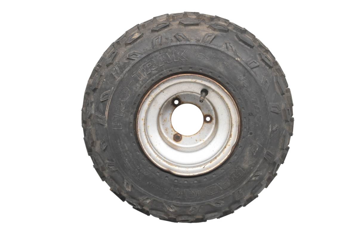 Rim is in good condition. Has light wear and scuff marks. Tire is in good shape with no plugs or holes. Comes as pictured. Was removed from a 1985 Yamaha Badger 80 YFM80.