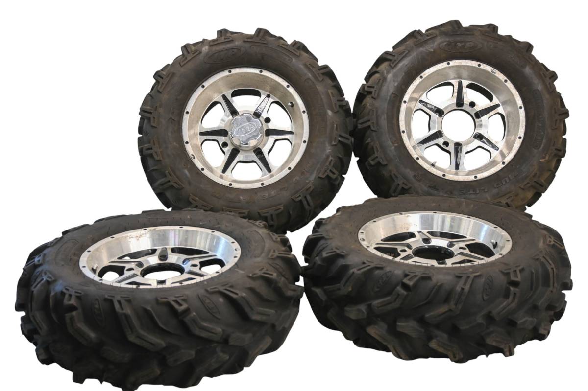 Rims are in good condition. Have light wear and scuff marks. Tires are in good shape with no plugs or holes. Only have one center cap and missing one lug nut. Comes as pictured. Was removed from a running 2012 Polaris Sportsman 500 HO 4x4 with 2390 miles and 237.5 hours.