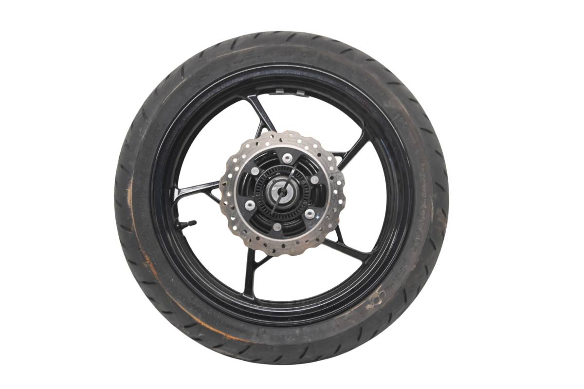 Rim is in good condition. Has light wear and scuff marks. Tire is in good shape with no plugs or holes. Comes as pictured. Was removed from a running 2023 Kawasaki Z400 ABS ER400D with 736 miles.