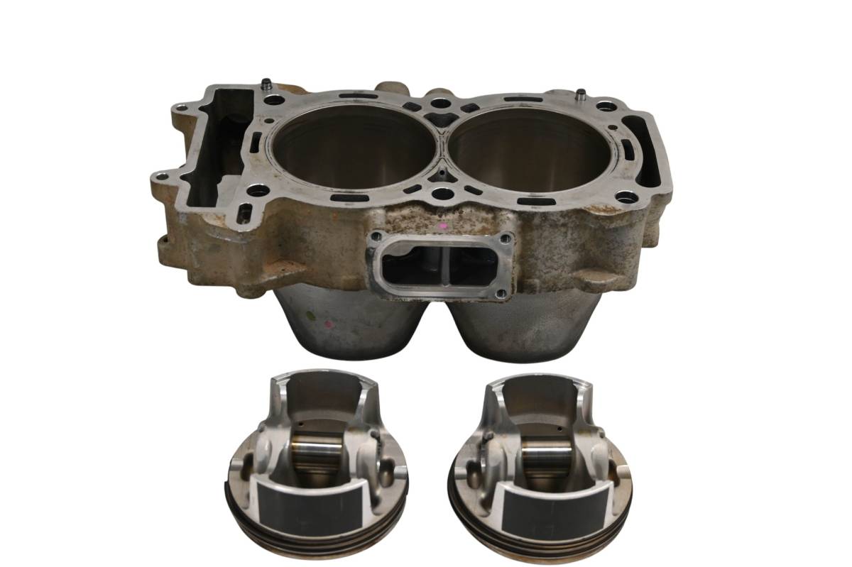 Cylinder is in good working condition. Piston skirts and cylinder have light wear. Bores measure 93mm. Both pistons will need new rings. Comes as pictured. Was removed from a running 2020 Polaris RZR Pro XP Ultimate with 5494.2 miles and 337.1 hours.