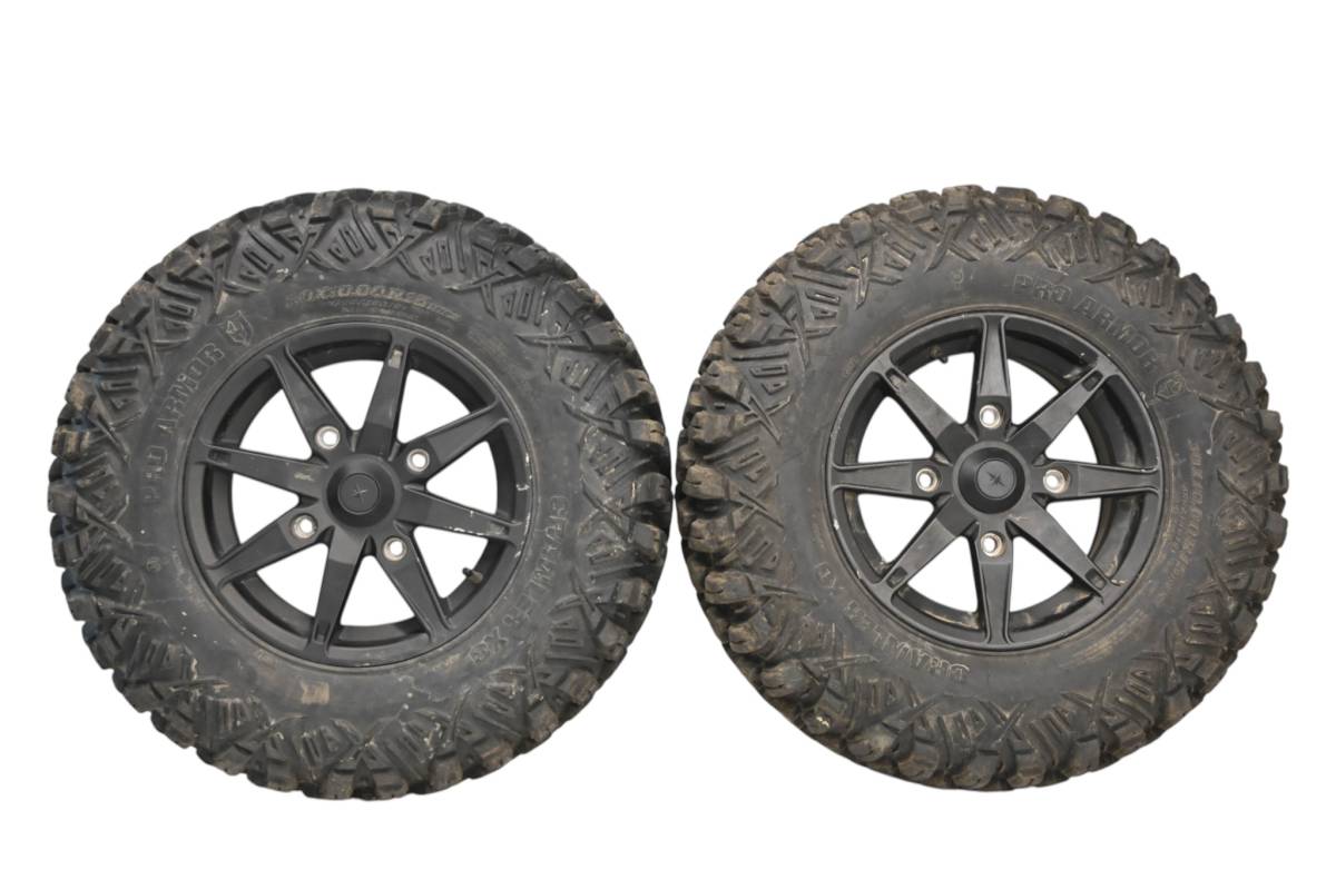 Rims are in good condition. Have light wear and scuff marks. Tires are in good shape with no plugs or holes. Pro Armor 30x10R15 CrawlerXG Comes as pictured. Was removed from a running 2021 Polaris General XP 1000 with 775.3 miles and 105.4 hours.